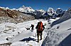 Der Abstieg ist leicht. Zuerst über verschneite Schotterflächen, später am Südhang des Gokyo Ri entlang,