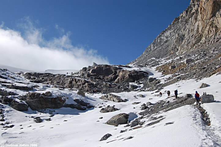 Wenige Meter unterhalb des Passes bei den Felsen wird unser heutiges Lager stehen.