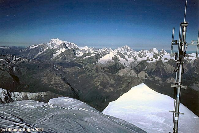 Ein Mobilfunkumsetzer oder sowas; mal was anderes als die gewöhnlichen Gipfelkreuze. Im Hintergrund der Mont Blanc.