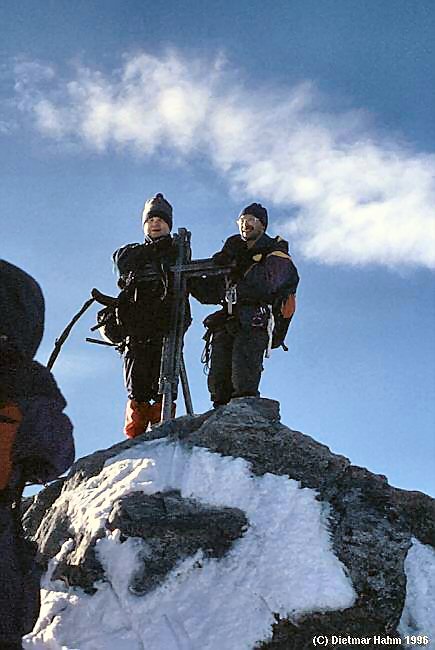 Dirk und Manni auf dem winzigen Gipfel des Nadelhorns. Hier heißt es Schlangestehen für das Gipfelfoto.